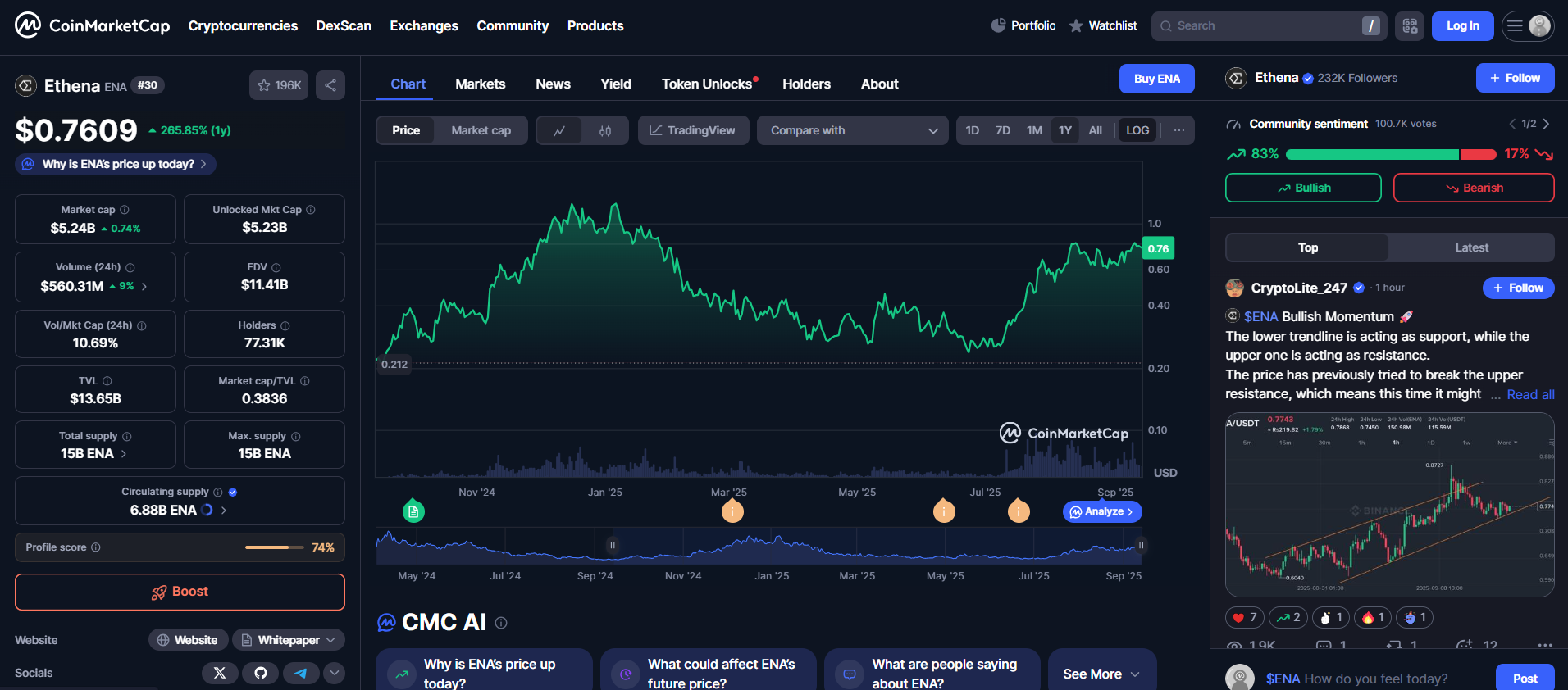 ENA در صرافیهای معتبر جهانی مانند Binance، Bybit و OKX لیست شده است. حجم معاملات روزانه به میلیاردها دلار میرسد که نشاندهنده نقدینگی بالای آن است.با این حال، نوسانات روزانه نسبتاً شدید است و برای معاملهگران کوتاهمدت میتواند فرصت یا تهدید محسوب شود.