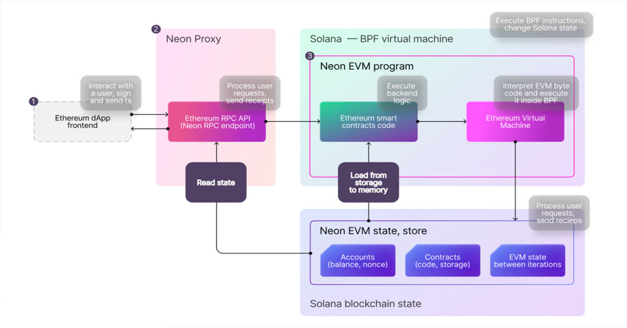 نئون این امکان را فراهم میکند که پروتکلهای اتریوم روی سولانا اجرا شوند، درحالیکه همچنان با محیط اتریوم سازگار باقی میمانند. این فرآیند از طریق تبدیل تراکنشهای اتریومی به فرمتی که توسط سولانا پردازش میشود، انجام میگیرد.