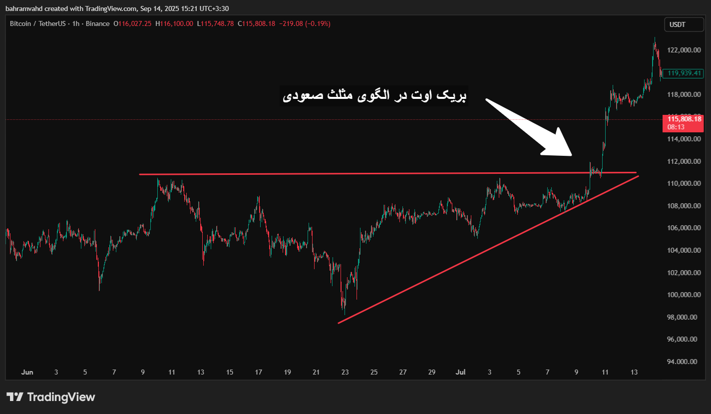 - بریک اوت الگوها: بریک اوتها همیشه از حمایت و مقاومت ساده شکل نمیگیرند؛ بسیاری از مواقع قیمت درون یک الگوی تکنیکال (مثلث، پرچم، کنج) حرکت میکند و با خروج از آن، شکست رخ میدهد. این نوع بریک اوتها اعتبار بالایی دارند، بهخصوص اگر با حجم معاملات بالا همراه شوند.