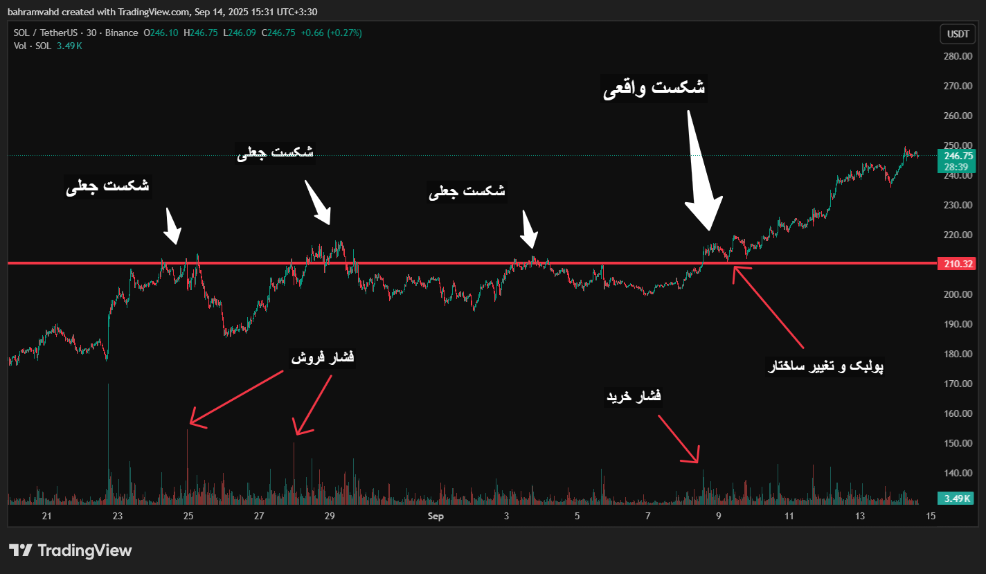 - حجم معاملات (Volume Confirmation): اگر شکست همراه با افزایش حجم معاملات باشد، احتمال واقعی بودن آن بیشتر است. چون نشان میدهد تعداد زیادی از معاملهگران وارد بازار شدهاند و از حرکت حمایت میکنند.