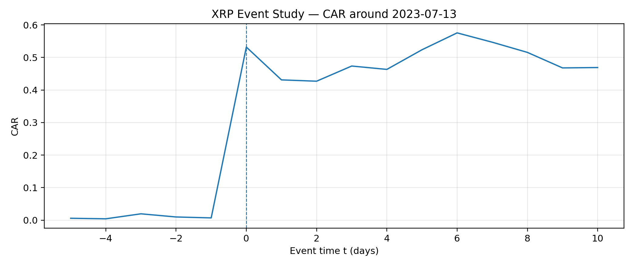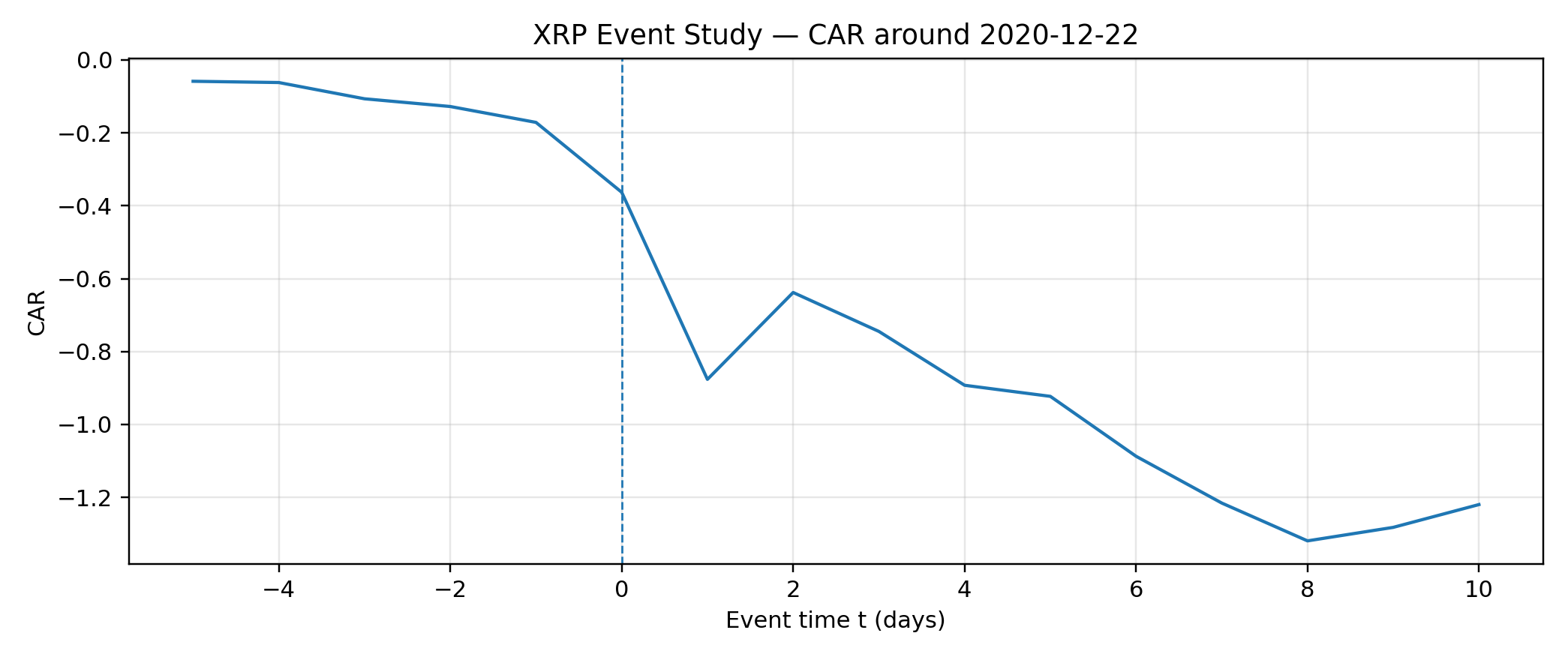 از سوی دیگر، مطالعه رویدادها (Event Study) نقش کلیدی اخبار حقوقی را در رفتار XRP نشان میدهد. در ۲۲ دسامبر ۲۰۲۰، همزمان با شکایت SEC، بازده تجمعی غیرعادی (CAR) طی ۱۰ روز بیش از ۱.۲- شد؛ بیانگر ریزش شدید و واکنش منفی بازار.