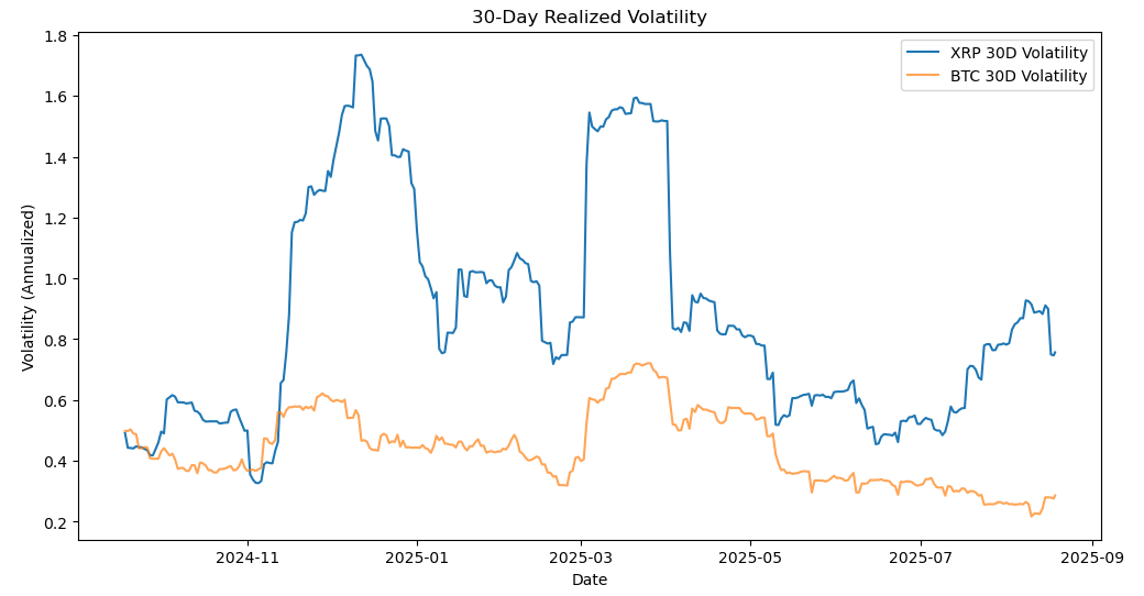 - میانگین نوسان (Volatility): نوسان ۳۰ روزه سالانهشدهی XRP حدود ۷۵٪ محاسبه شده است، در حالی که برای بیتکوین این عدد نزدیک به ۲۷٪ بوده است. این اختلاف نشان میدهد که فرصتهای معاملاتی پرریسک و پربازده در XRP بسیار بیشتر از بیتکوین دیده میشود.
