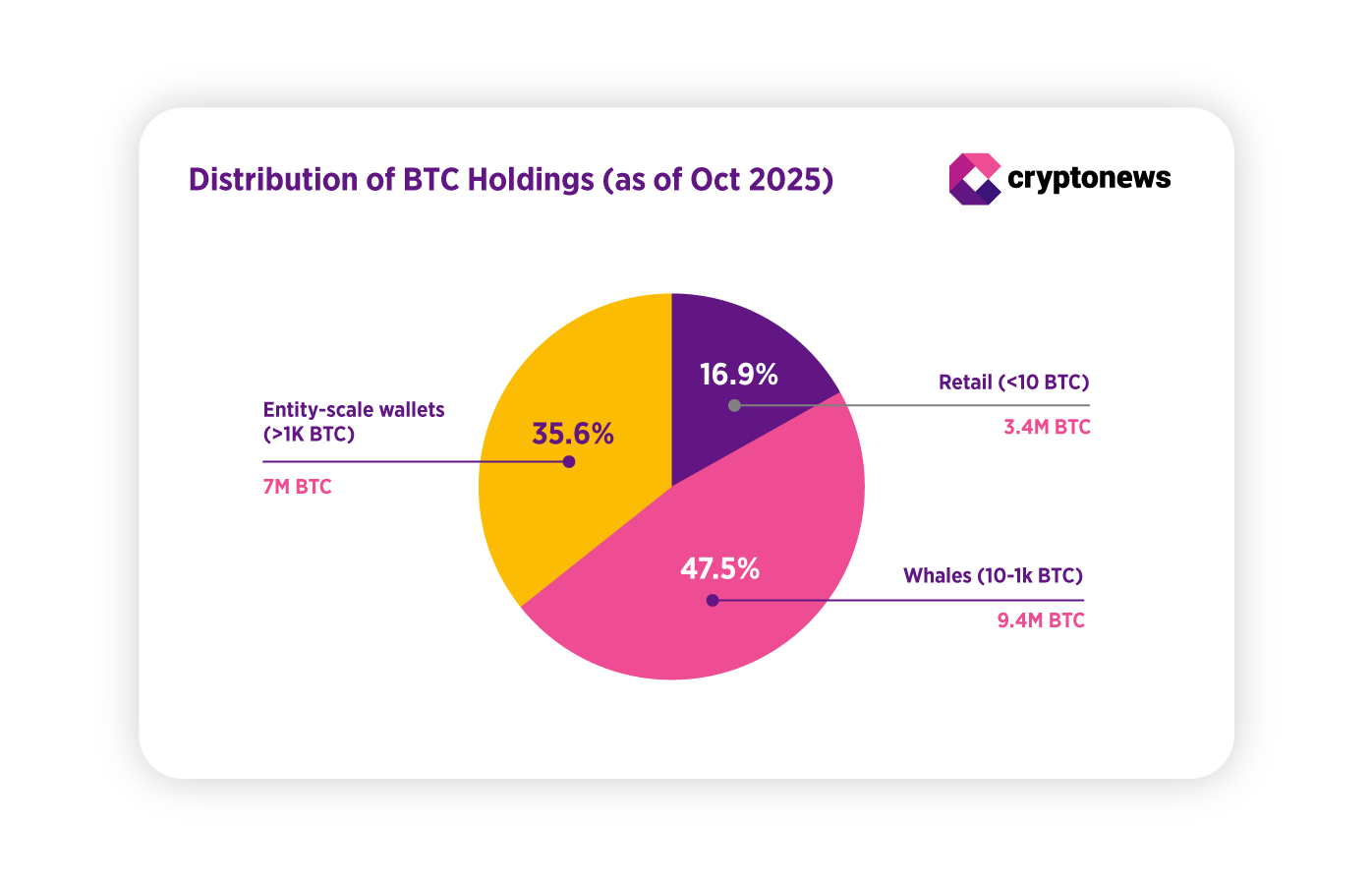 برای درک این تحول، لازم است ببینیم پیش از این نقطهی عطف شرایط چگونه بود. سال ۲۰۲۰ را در نظر بگیریم؛ زمانی که قیمت بیتکوین بسیار پایینتر از امروز بود و بیشتر طرفداران آن افرادی بودند که خود بهطور مستقیم بیتکوین را در کیفپولهای شخصی نگهداری میکردند. در آن دوره، سرمایهگذاران خرد — یعنی کسانی که کمتر از ۱۰ بیتکوین داشتند — مجموعاً حدود ۳.۱ میلیون BTC در اختیار داشتند. این رقم چیزی در حدود ۱۷ درصد از کل بیتکوینهای در گردش بود. در همین زمان، نهنگها (کیفپولهای دارای ۱۰ تا ۱,۰۰۰ BTC) و نهادهای بزرگ (دارای بیش از ۱,۰۰۰ BTC) نیز بخش عمدهی باقیمانده را میان خود تقسیم کرده بودند.